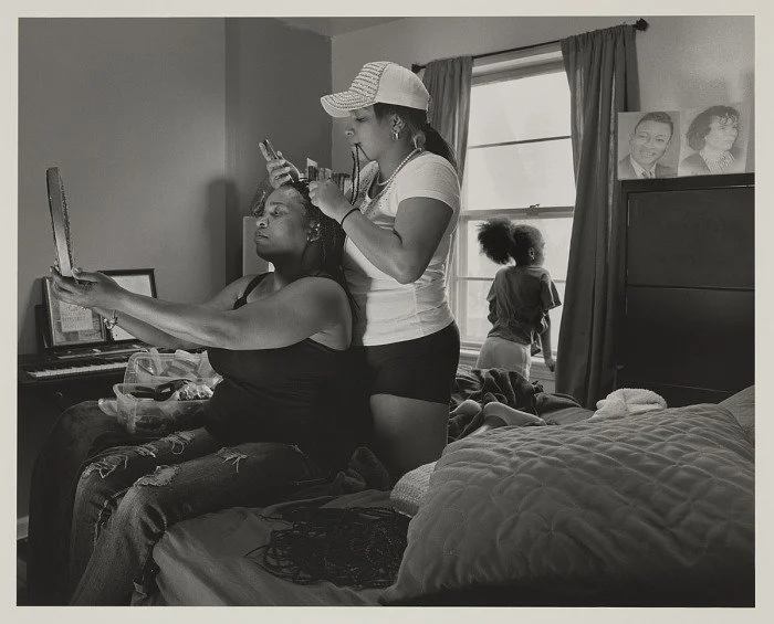 Shea Doing Crochet Braids in Her Cousin Andrea’s Hair for Andrea’s Daughter’s Wedding, 2016–17. Photograph by LaToya Ruby Frazier.